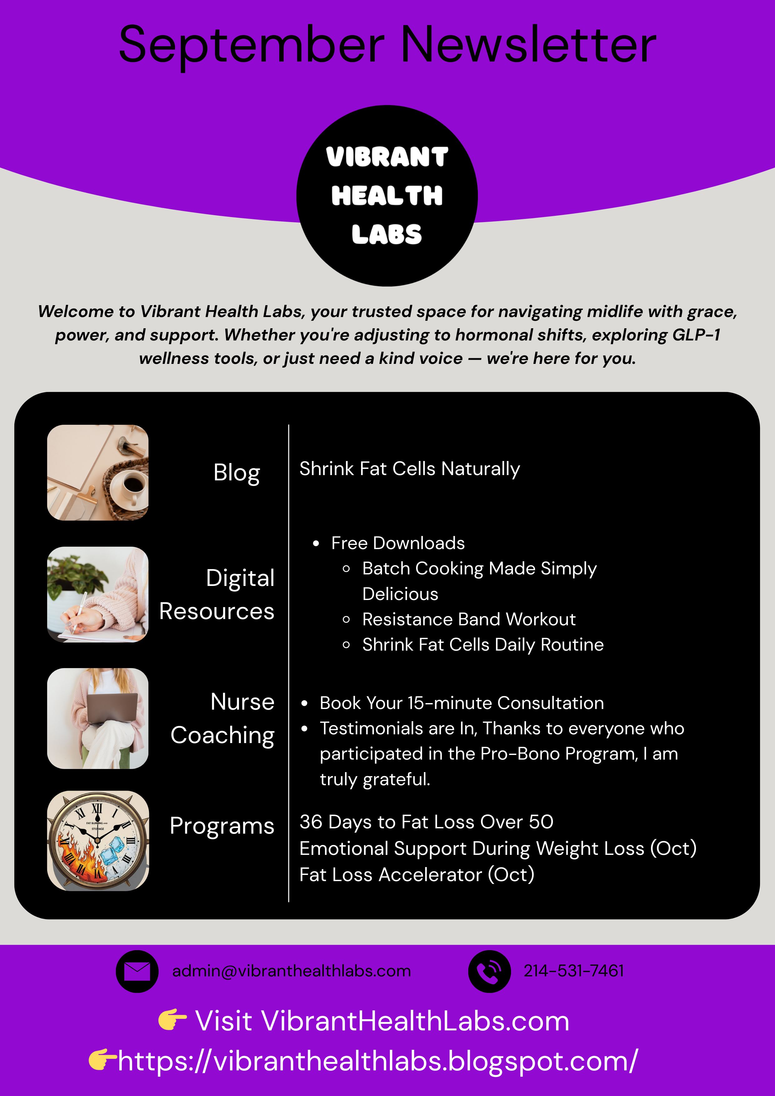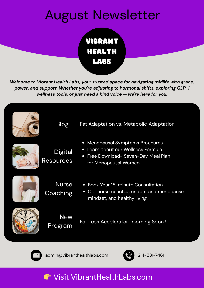Stay inspired and informed with the Vibrant Health Labs monthly newsletter. Get expert tips on fat loss after 50, hormone health, stress management, meal prep, and sustainable lifestyle changes—delivered straight to your inbox. Join our community of women over 50 committed to strength, energy, and vibrant living